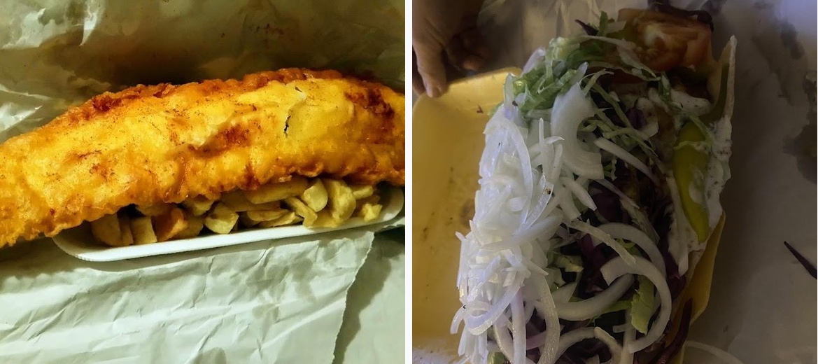 Definitely try the cod fish and chips, along with a doner kebab for a filling, satisfying experience.